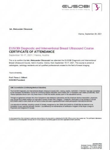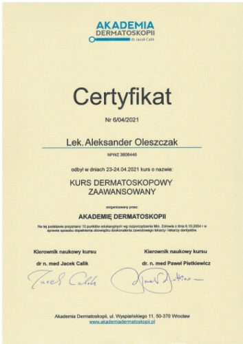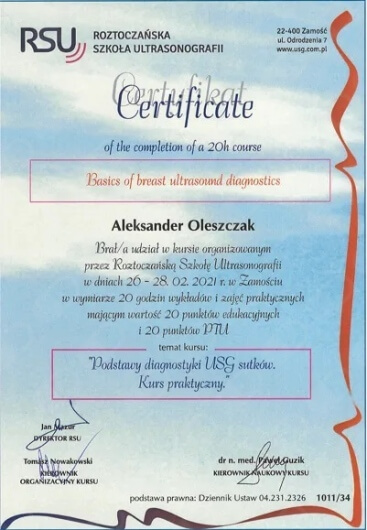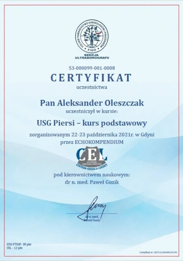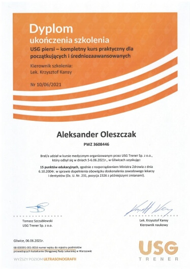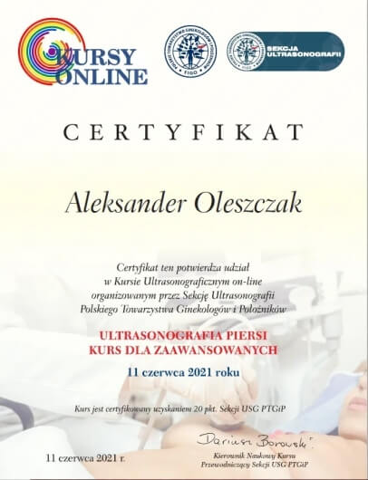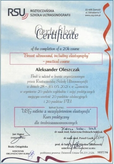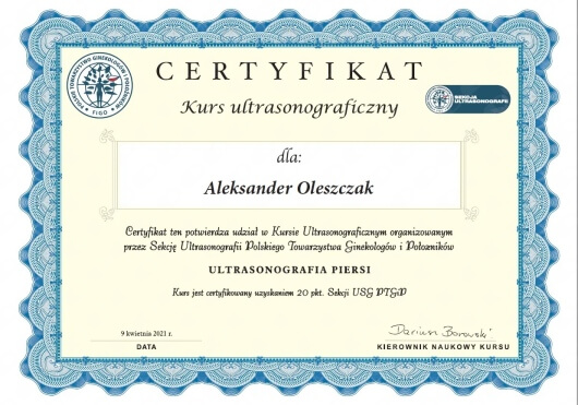 Zgłosiłam się do doktora Oleszczaka w celu konsultacji wyniku USG piersi i zmian, które zostały znalezione. Pan Doktor rzeczowo wyjaśnił mi dalszą ścieżkę postępowania i poprowadził w dalszej diagnostyce. Jestem bardzo zadowolona z wizyt, przede wszystkim czuję się naprawdę zaopiekowana i wiem, co dalej mnie czeka. Doktor jest konkretny i empatyczny. Bardzo polecam!