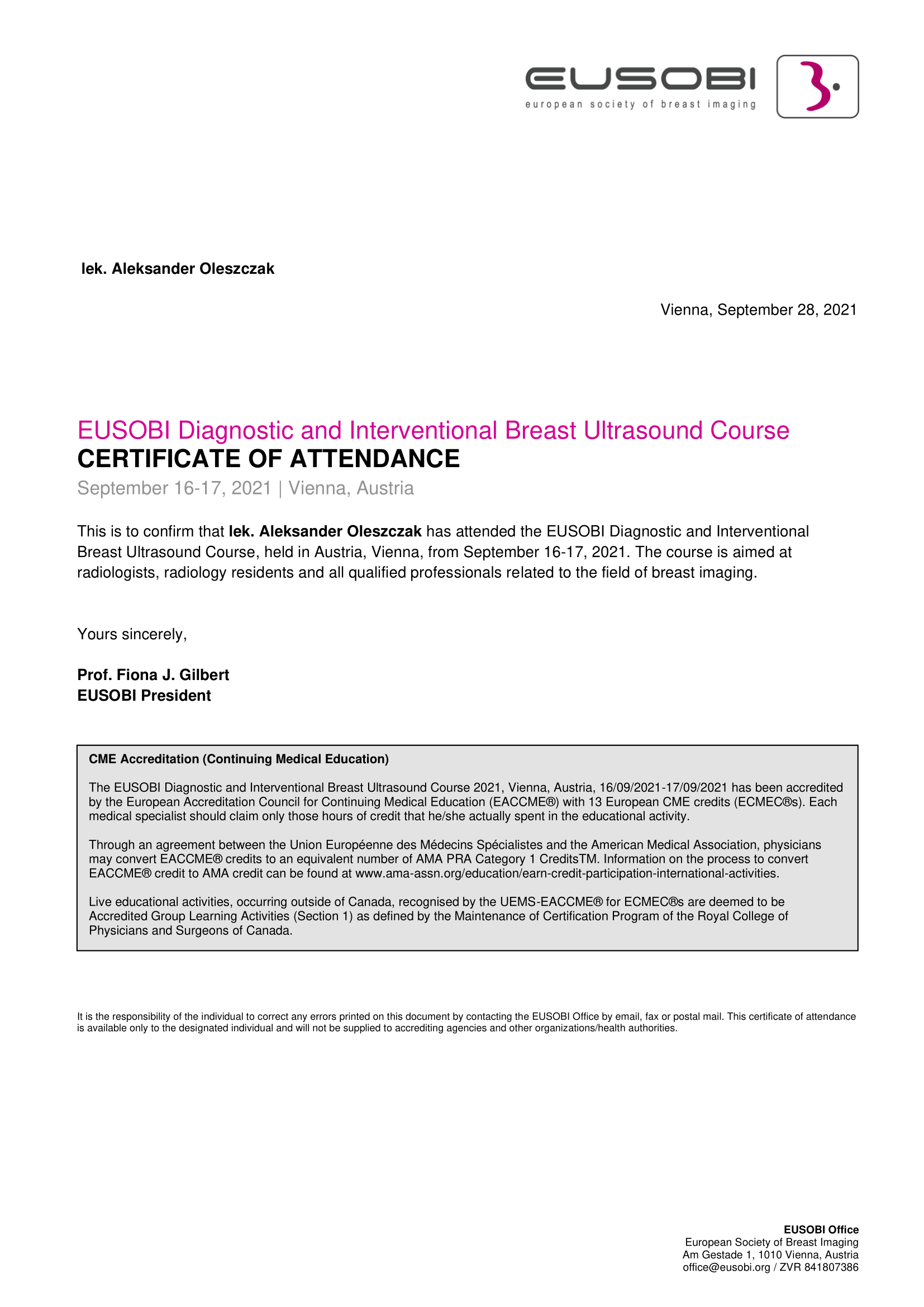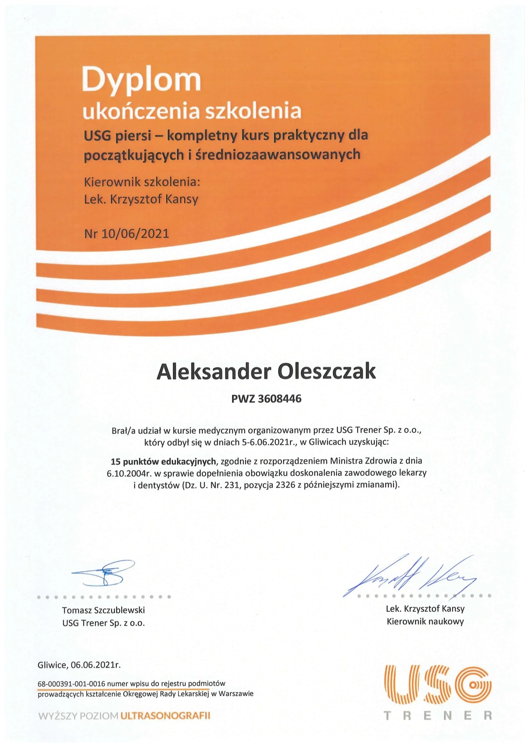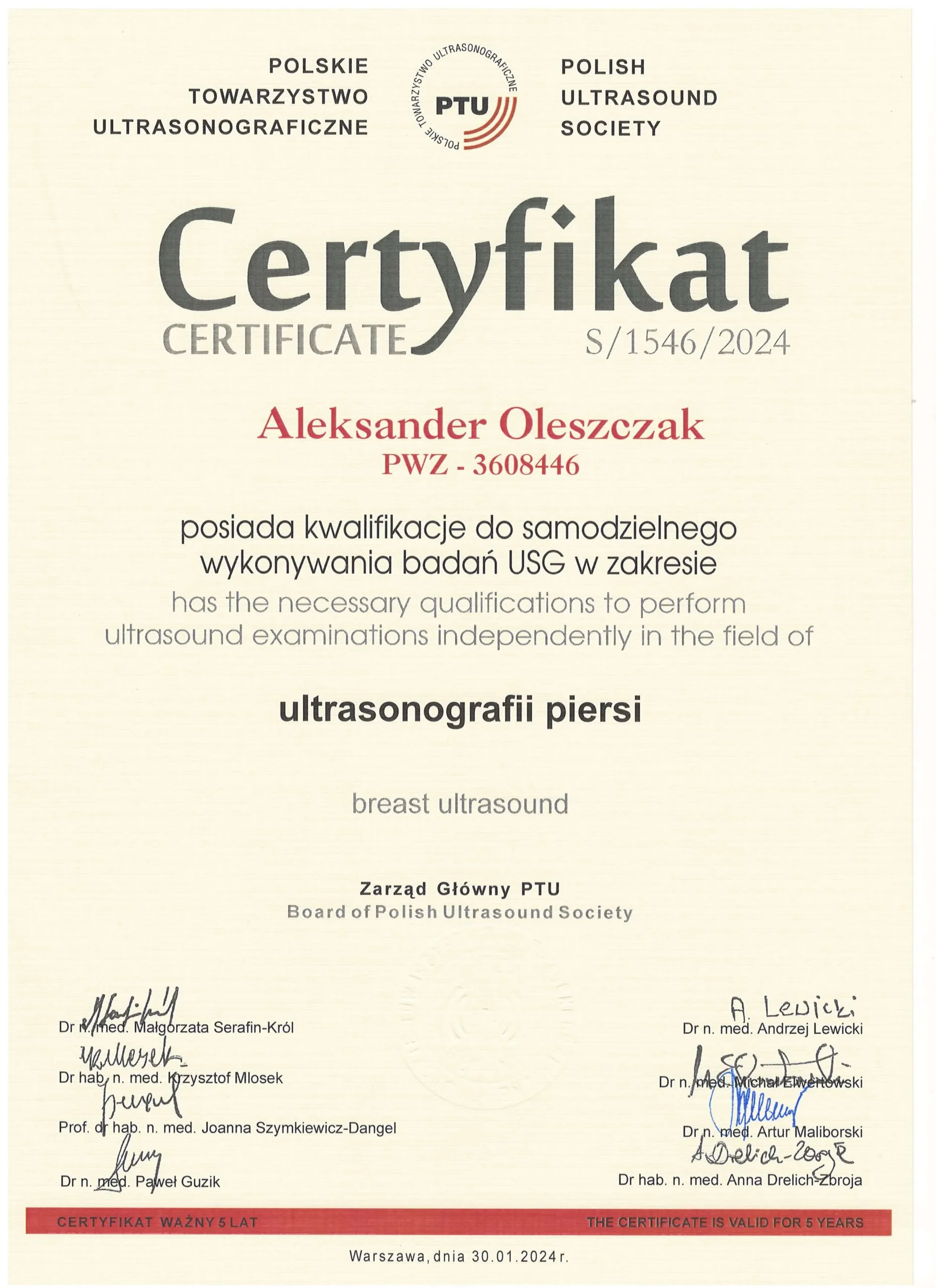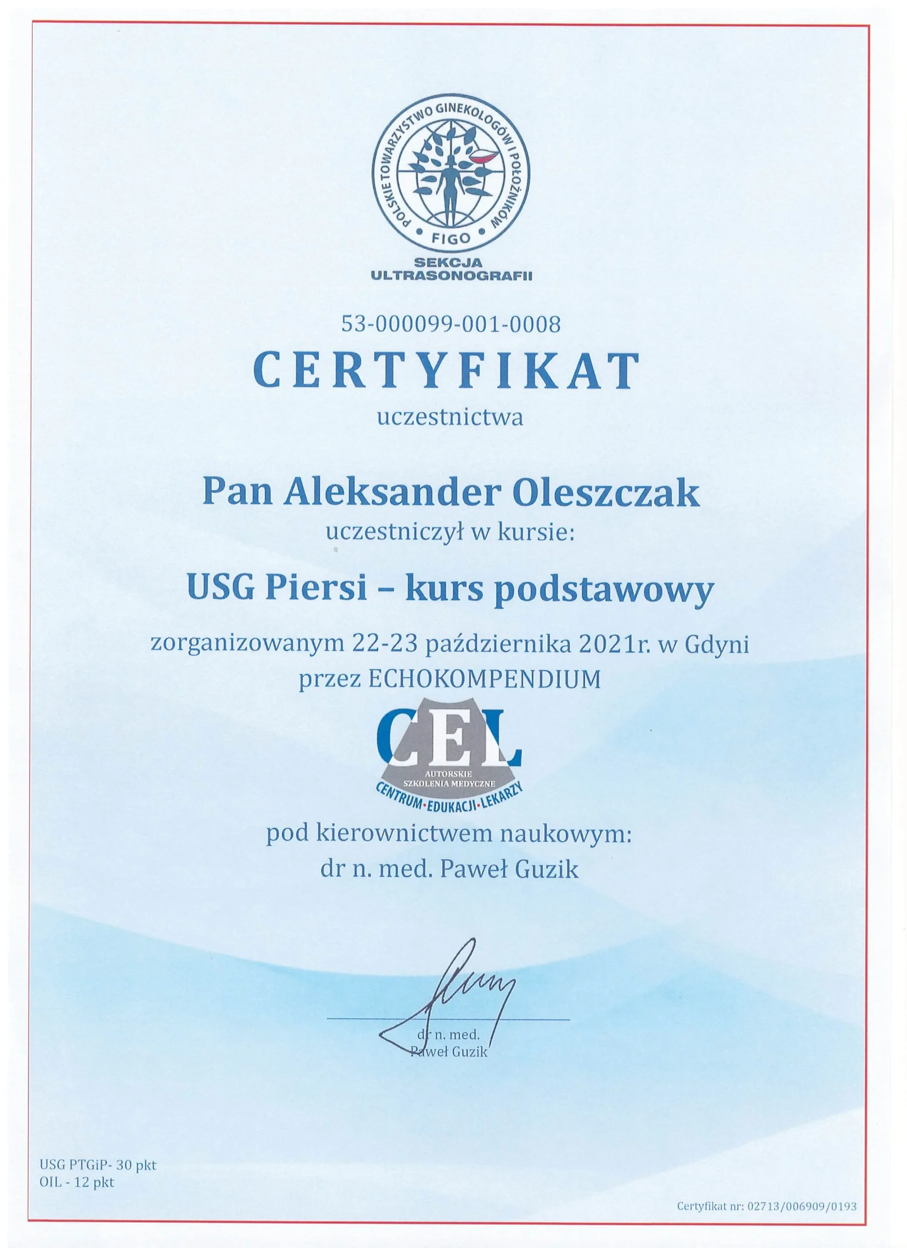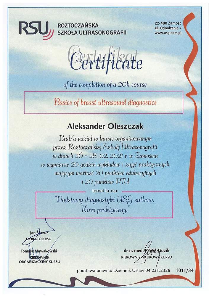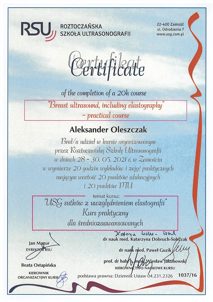 Nieustannie poszerzam swoją wiedzę w tym zakresie, regularnie uczestniczę w kursach, szkoleniach i konferencjach. Zdobyłem również certyfikaty potwierdzające moje kwalifikacje w diagnostyce ultrasonograficznej piersi – ponieważ wierzę, że doświadczenie musi iść w parze z aktualną wiedzą.