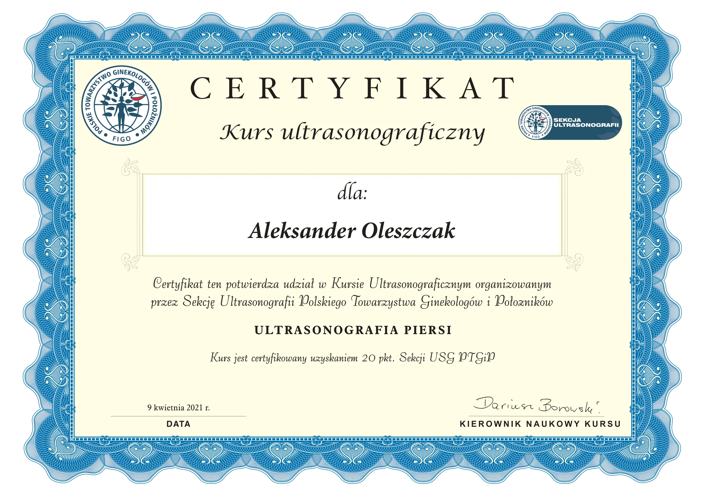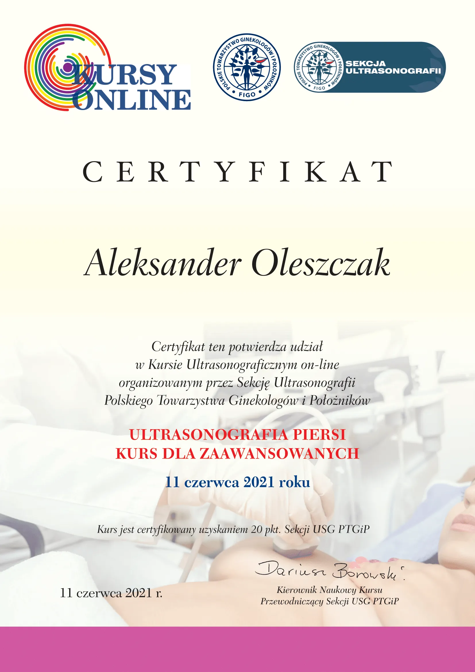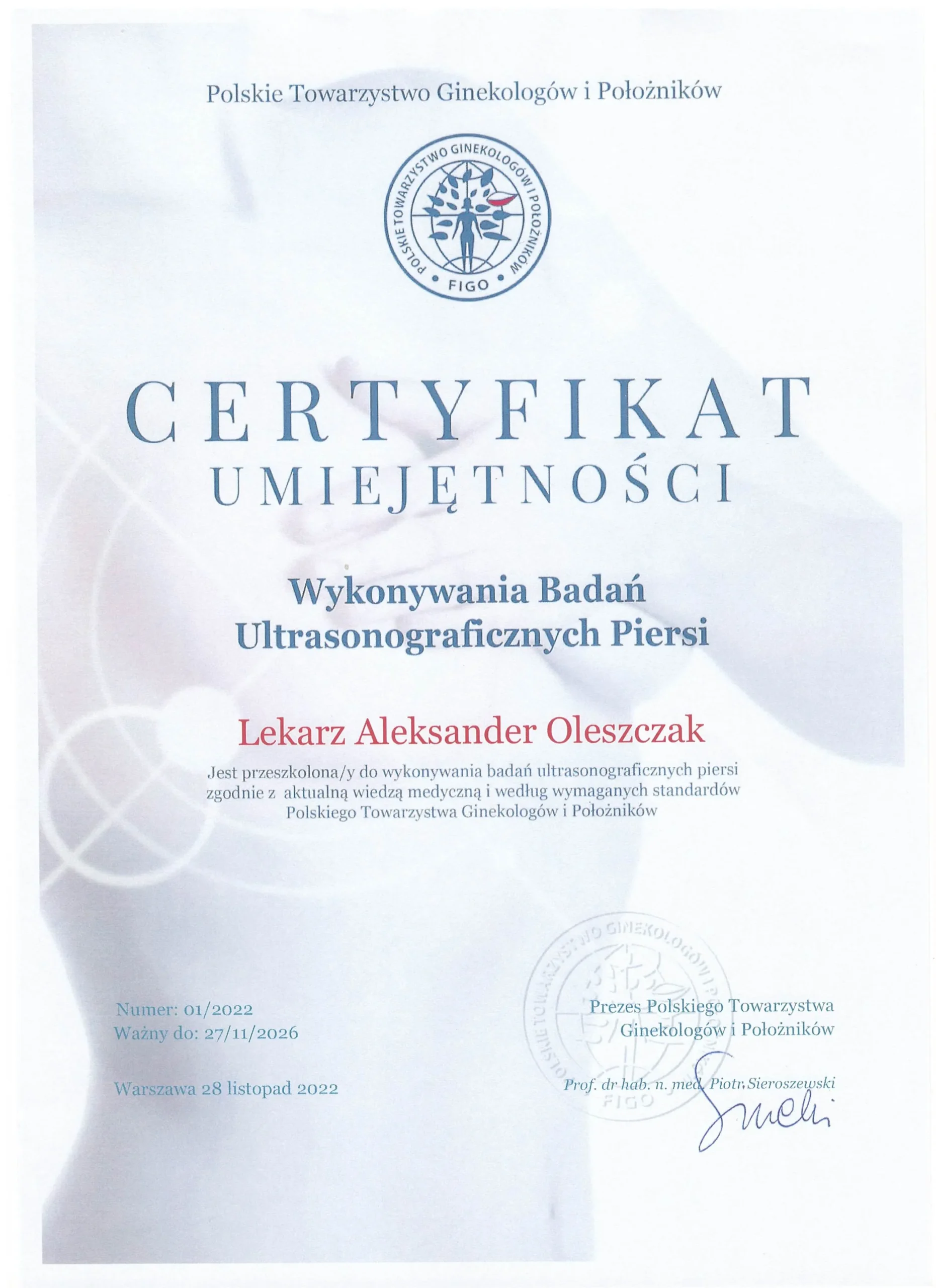 Potwierdzeniem mojego przygotowania są certyfikaty Polskiego Towarzystwa Ginekologów i Położników oraz Polskiego Towarzystwa Ultrasonografii.